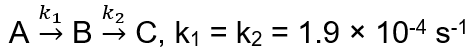 . The initial concentrations of both B and C is 0.0019 M while the initial concentration of A is 0.0105 M. What is the time at which the concentration of B is maximum?